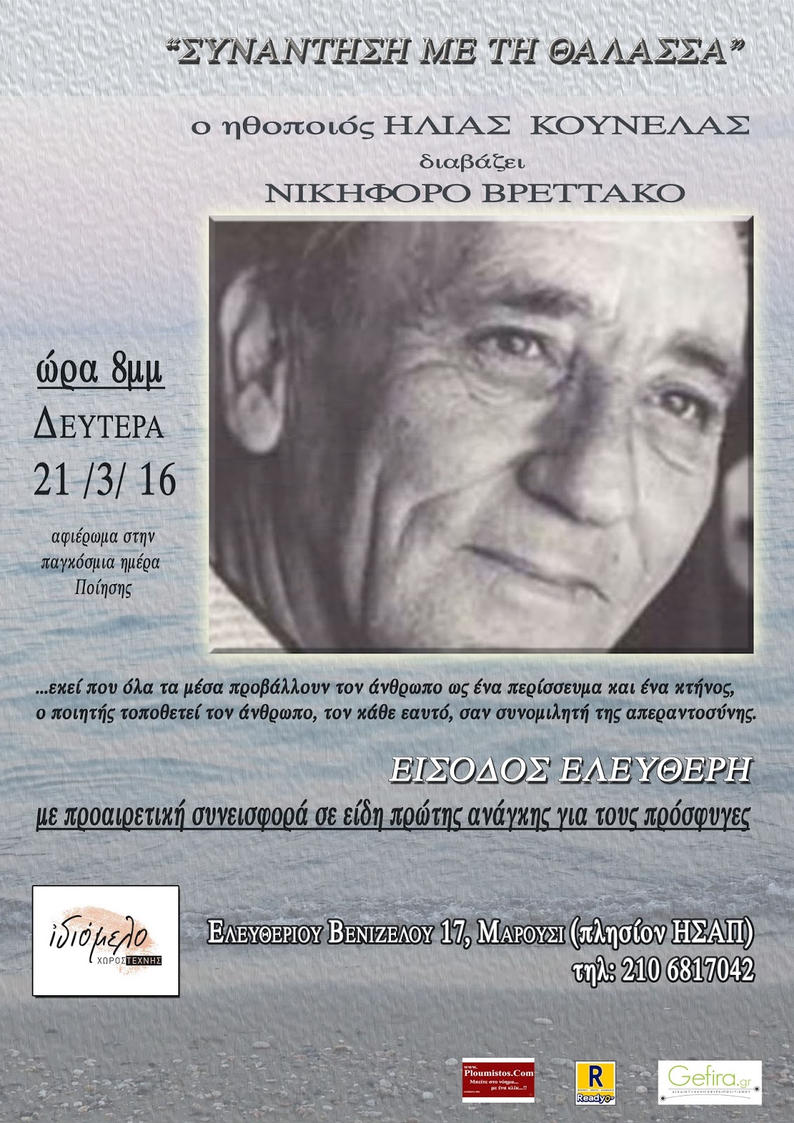 Την Δευτέρα 21 Μαρτίου 2016, με αφορμή την Παγκόσμια Ημέρα της Ποίησης, ο ηθοποιός και σκηνοθέτης Ηλίας Κουνέλας έρχεται στον Χώρο Τέχνης «Ιδιόμελο» να διαβάσει την προτελευταία συλλογή του ποιητή Νικηφόρου Βρεττάκου «ΣΥΝΑΝΤΗΣΗ ΜΕ ΤΗ ΘΑΛΑΣΣΑ» - Η συλλογή, που αποτυπώνει την πνευματική παρακαταθήκη του εγκάρδιου ποιητή, έρχεται σε πραγματική αντίστιξη με την καταστροφική και την εσχατολογική διάθεση των ημερών μας και, εκεί που όλα τα μέσα προβάλλουν τον άνθρωπο ως ένα περίσσευμα και ένα κτήνος, ο ποιητής τοποθετεί τον άνθρωπο, τον κάθε εαυτό, σαν συνομιλητή της απεραντοσύνης.